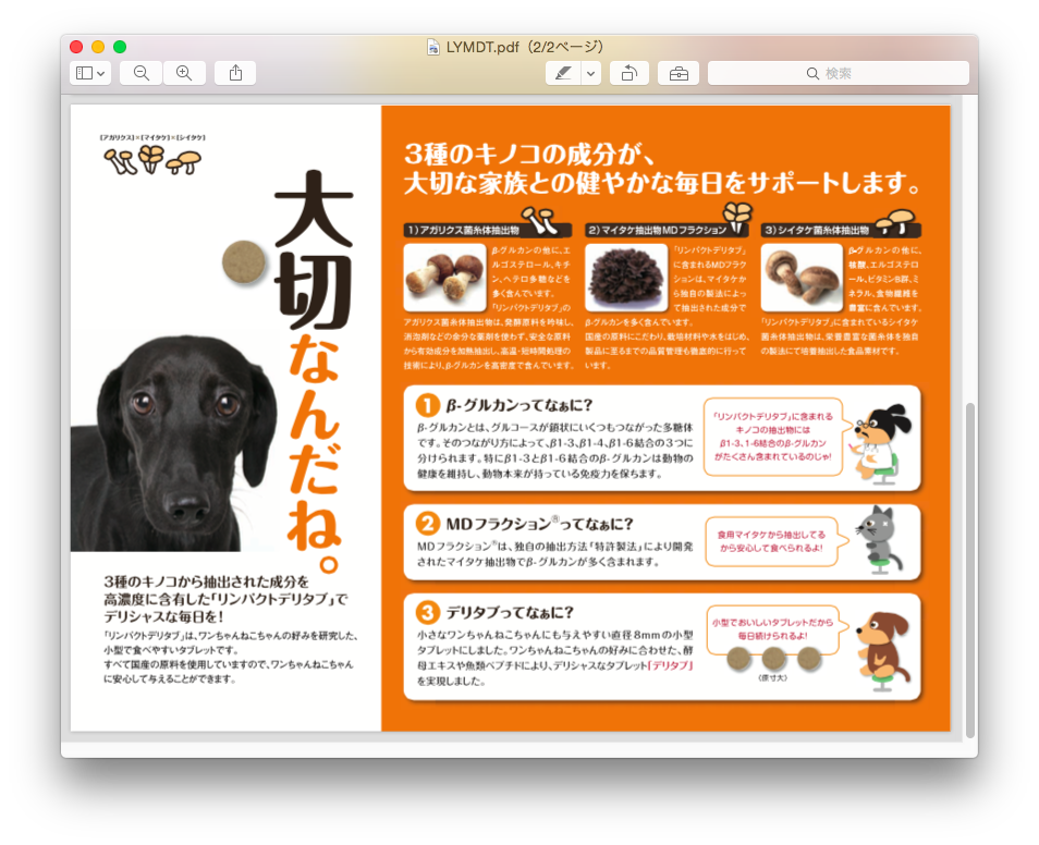 原材料:アガリクス菌糸体抽出物、マイタケ抽出物MDフラクション、シイタケ菌糸体抽出物、キトサン、結晶セルロース、酵母エキス、カルメロースカルシウム、魚類ペプチド、軽質無水ケイ酸、ステアリン酸マグネシウム、ビタミン類(E、C)、ミネラル類(セレン酵母、亜鉛酵母)