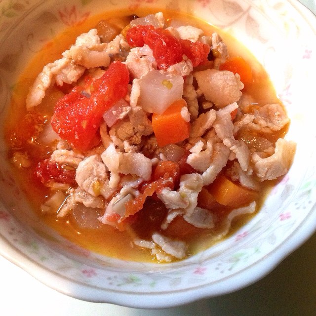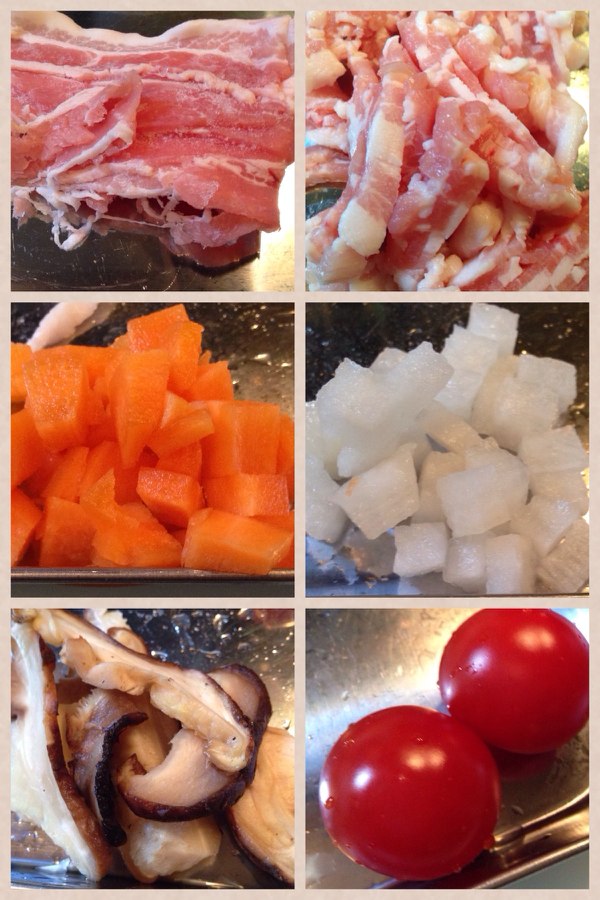 材料:豚バラ肉、人参、だいこん、干し椎茸、プチトマト