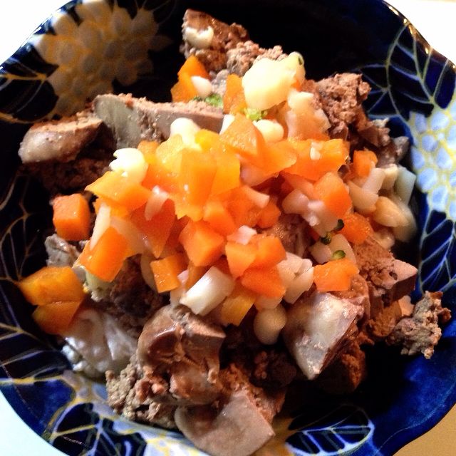 鶏ささみ40g+鶏レバー70g+野菜煮(人参、しめじ、ブロッコリー)40g