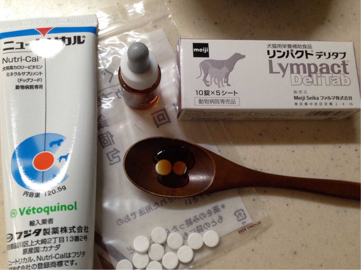 膵炎の時に処方されたニュートリカルが美味しいみたいで、これに絡めて錠剤をあげるとペロリと飲んでくれるので、お薬あげるのがだいぶ楽に。